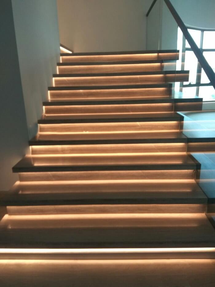 Thêm một lựa chọn độc đáo cho việc ốp cầu thang bằng đá marble: đá marble màu xám được ốp mặt bậc, phần cổ bậc được lắp hệ thống đèn chiếu sáng giúp làm tăng hiệu ứng huyền ảo cho “xương sống” của ngôi nhà, đặc biệt là khi đêm về