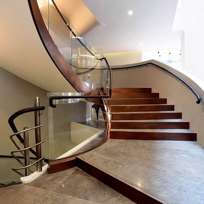 Đây là loại cầu thang có kết cấu rất đặc biệt, cả về màu sắc và xu hướng mở rộng diện tích của từng bậc thang. Có thể thấy phần mặt bậc của cầu thang được ốp bằng đá marble màu nâu ghi, phần cổ bậc được ốp bằng chất liệu gỗ, trông vừa cổ điển, vừa độc đáo lại vô cùng bắt mắt