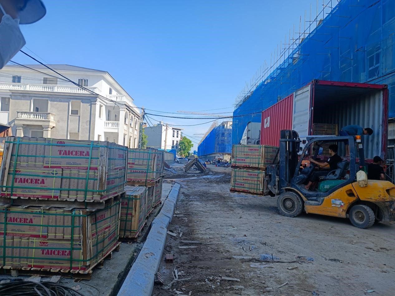 Công tác hạ những kiện gạch Taicera nhanh chóng của đội ngũ vật tư